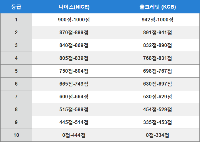 마지막으로 신용등급 점수표는 다음과 같습니다.