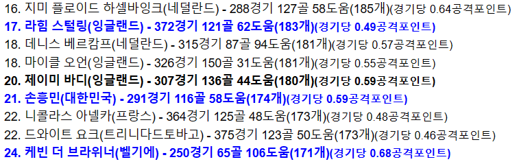 7. 프리미어리그 역대 공격포인트 랭킹 20위 진입